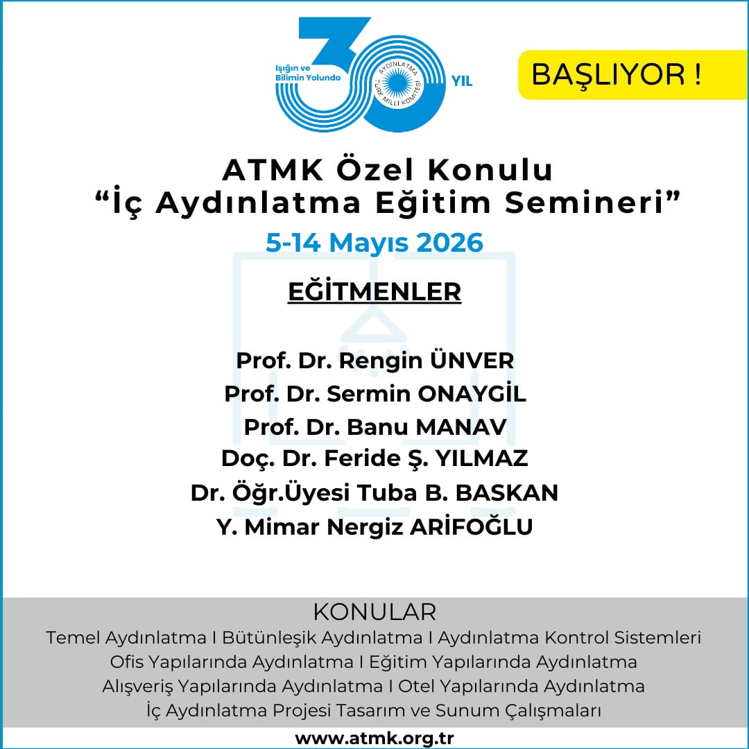 5 Mayıs – 14 Mayıs 2026 tarihleri arasında, “ATMK Özel Konulu İç Aydınlatma Eğitim Semineri 2026-1” modülü gerçekleştirilecektir. Seminer dersleri, aydınlatma alanında çalışan akademisyenler ve sektör uzmanları tarafından verilecektir. Eğitim kapsamında, İç Aydınlatmaya yönelik genel bilgilerin yanı sıra ofis, alışveriş, eğitim ve otel yapılarının iç mekan aydınlatma tasarımı konuları ayrıntılı olarak ele alınacaktır.